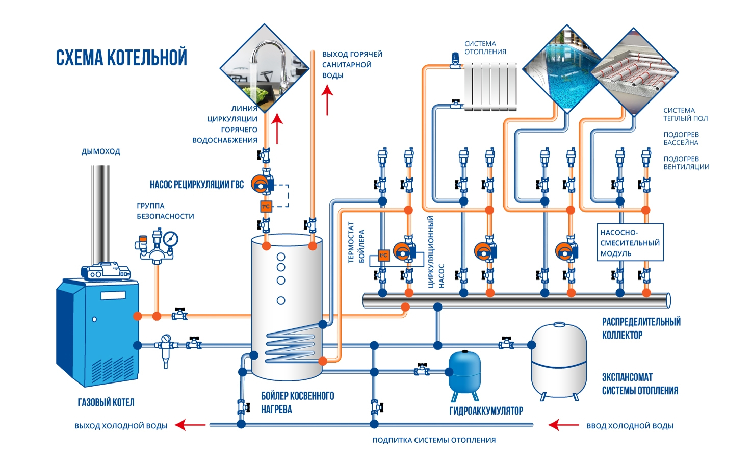 При подключении под ключ есть возможность ввода резервного котла в случае выхода из строя основного.
